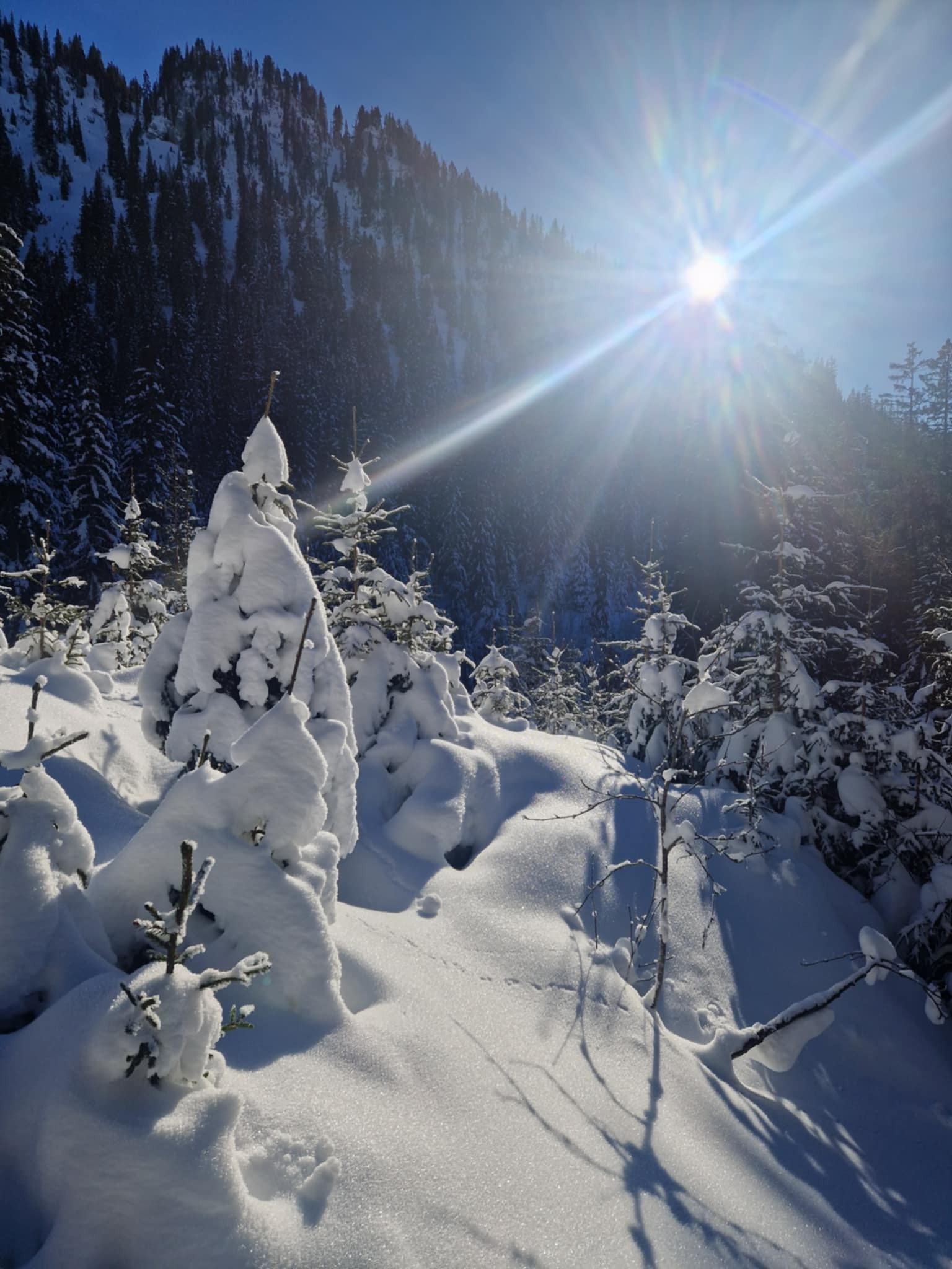 Stroll through snow caped trees that are reaching the sky and sometimes are hardly visible because of the amount of snow.